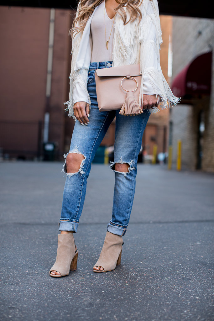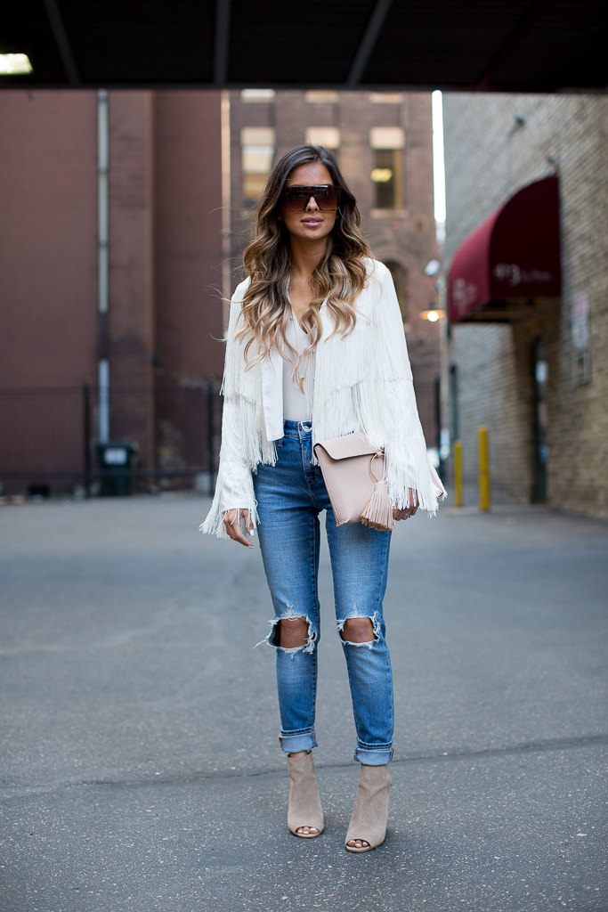 It’s the season for fringe and tassels. Festival season always kicks off western, bohemian vibes and adding a touch of fringe is a great way to play into the trend. This white fringe lightweight jacket is a such a fun way to wear it. I love that it’s white because neutrals work with everything and at under $100, it’s an affordable summer jacket option. I paired it with this giant tassel clutch in the perfect shade of pink (the black is on sale now under $25!).