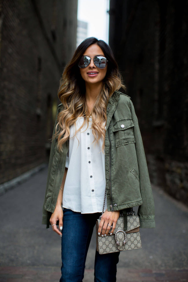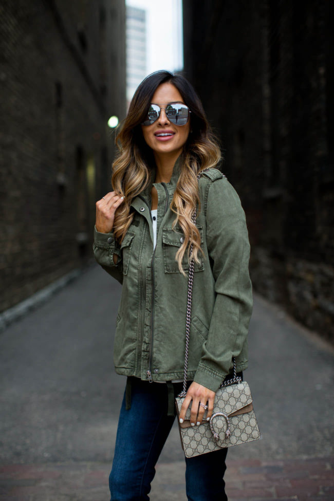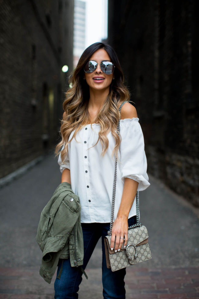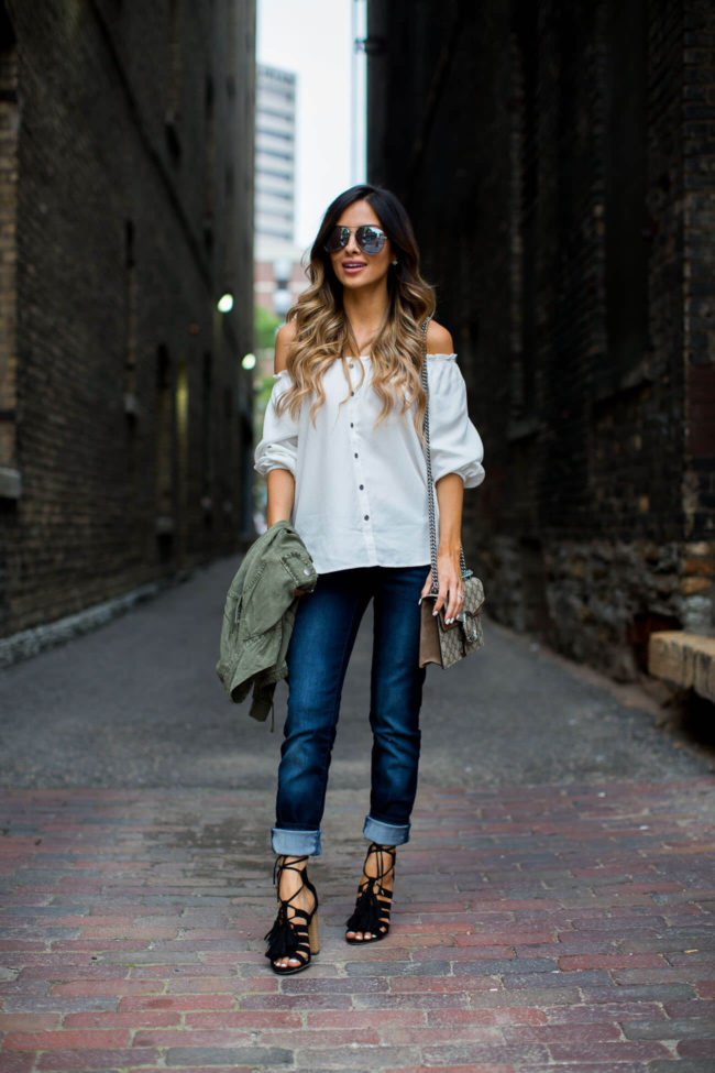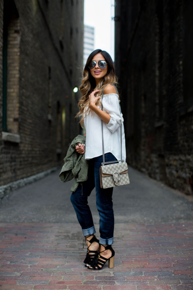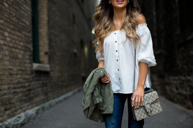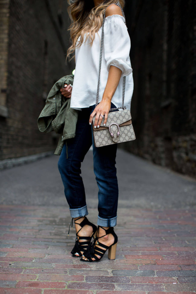 Off-The-Shoulder Top (wearing an XS) // Skinny Jeans (wearing a size petite 00) // Utility Jacket // Black Lace-Up Tassel Heels // Gucci Crossbody Bag (LOVE this one)