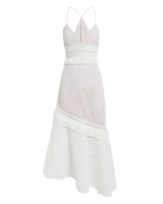 This dress is the epitome of chic with its asymmetrical hemline and romantic eyelet embroidery.