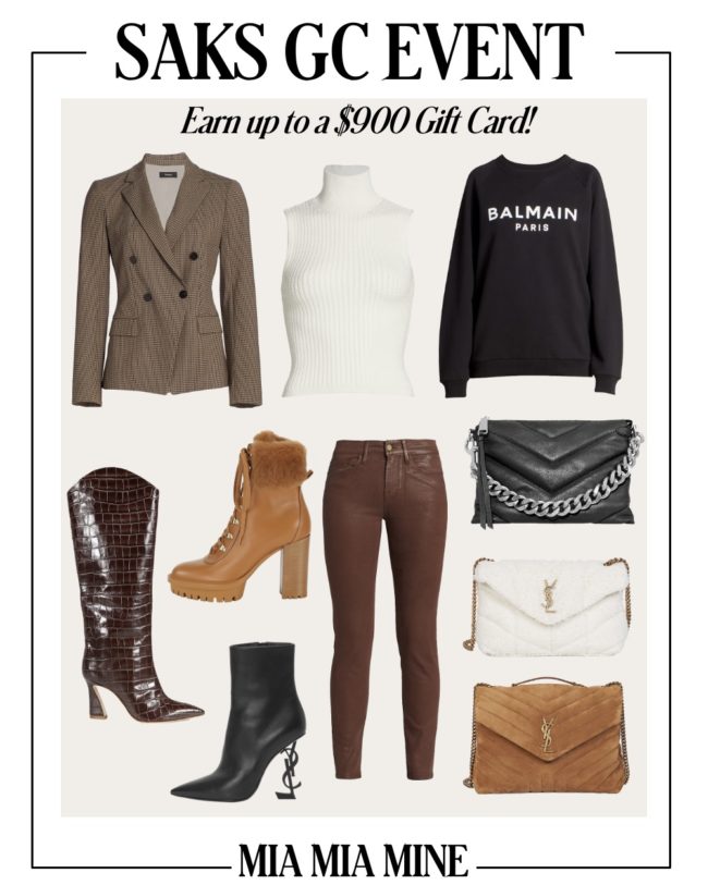 One of the ways I like to maximize my wardrobe is shopping for pieces that can pull double duty. That usually calls for blazers that can be styled for work and play, boots that go from the desk to drinks, and denim you can wear for any occasion. I tend to focus my fall spending on these pieces since I’ll often wear them repeatedly and thus want them to hold up through multiple washes and wears. It’s no secret that Saks Fifth Avenue is one of my favorite luxury retailers to score premium looks that last. I’m excited to share that you have yet another opportunity to shop and save these next few days with the Saks Fall Gift Card event taking place. The savings are even bigger this time around since you can earn up to a $900 gift card (that’s $200 more than past events). It’s seriously the best time refresh your fall work-to-weekend wardrobe. Keep scrolling for the items to get you started.