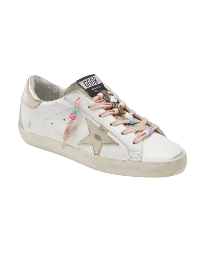 These Superstar's get a youthful treatment with pink laces and colorful beads.